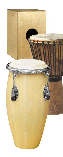 Cajon, Djembé und Congas gehören mit vielen anderen Schlaginstrumenten zur Familie der Hand- und Kleinperkussion.