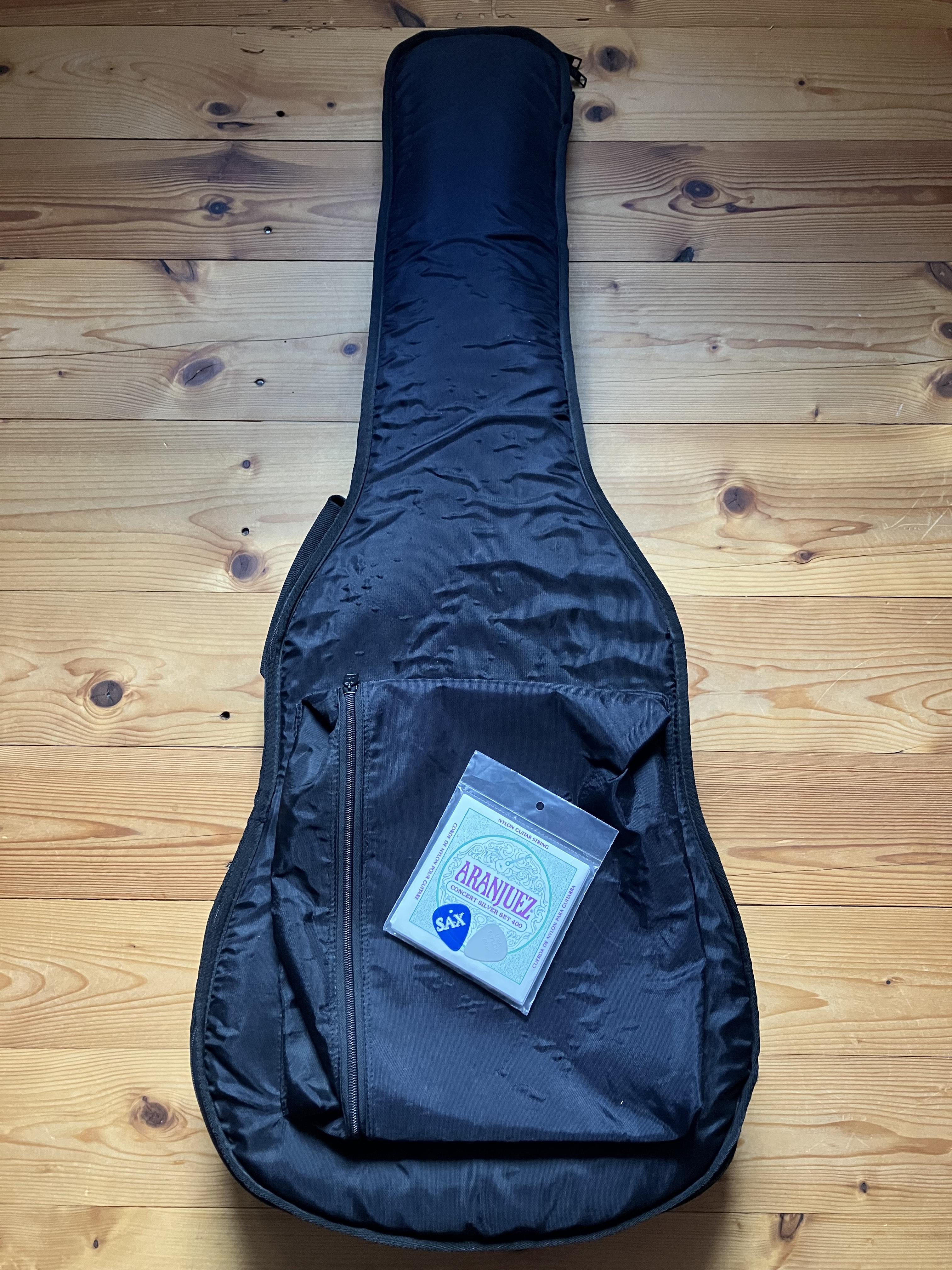 Inkl. Gitarrentasche mit Rucksackgarnitur, einem Satz Aranjuez-Nylonsaiten und 2 Plenktren.